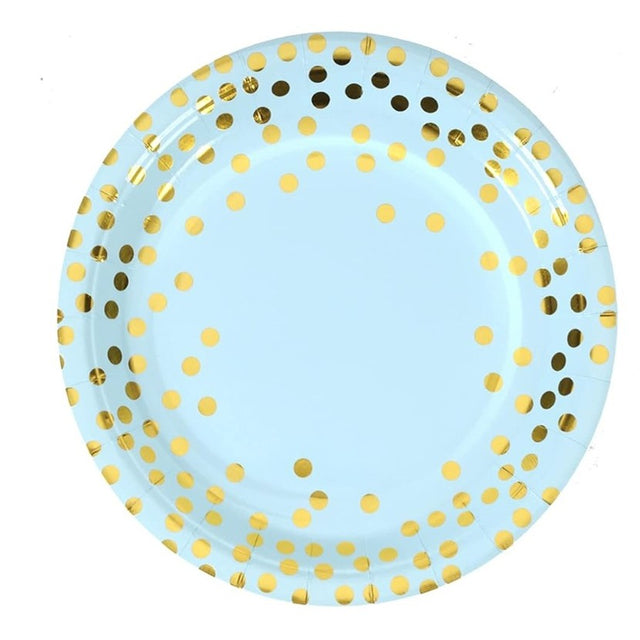 Set 10 Farfurii Unica Folosinta, Flippy, Imprimeu cu Buline, din Carton, Diametru 23 cm, Albastru/Auriu