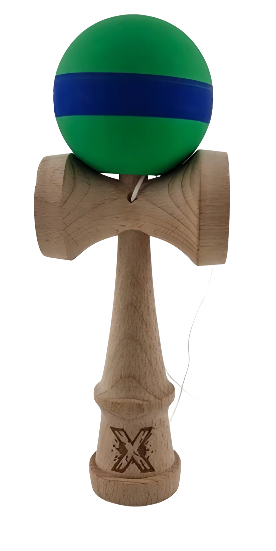 Kendama X Originală, Flippy, 18 cm, profesională, din lemn, model cu dunga, verde/albastru, +9 ani