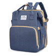 Rucsac multifuncțional pentru mămici, cu pătuț pliabil și bază de schimbat impermeabilă, realizat din pânză Oxford rezistentă la apă. Spațios, ușor și elegant, în culoarea albastru închis, perfect pentru ieșirile zilnice cu bebelușul.