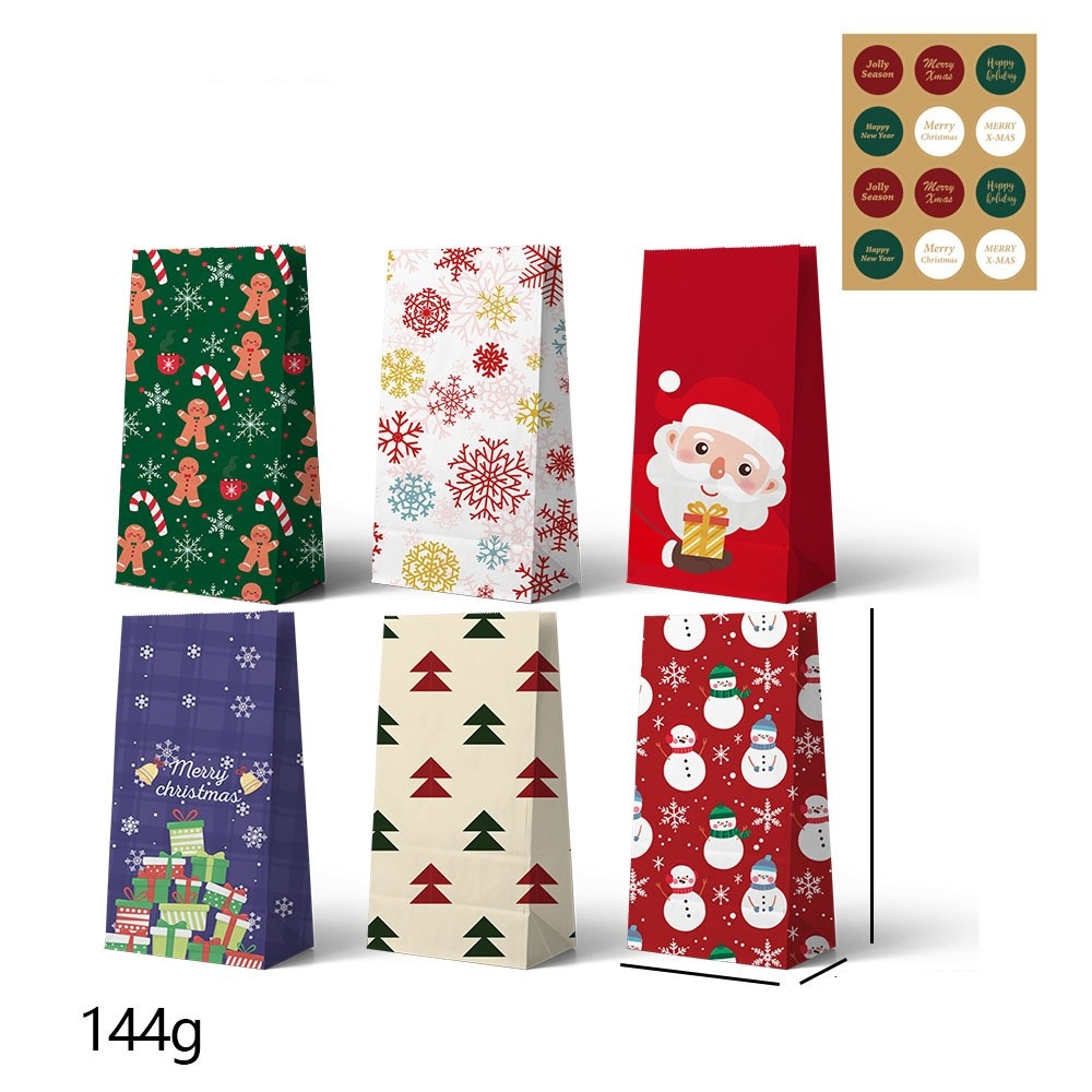 Set 12 Pungi de Cadou, Vivimall, Tema Craciun, cu Motive Festive, 12 Stickere Incluse, 22 x 12 x 8 cm, din Hartie, Multicolor
