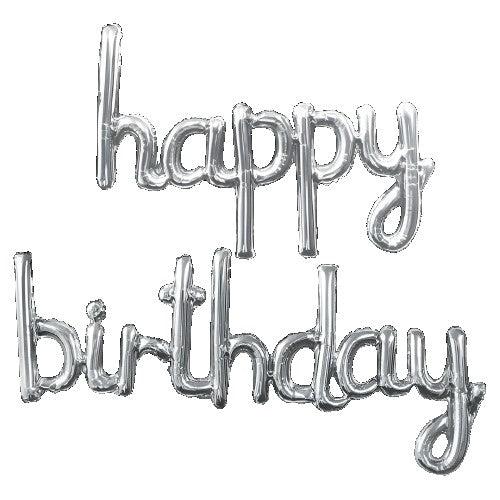 Set Baloane din Folie Metalizata, Model Happy Birthday, 45x85 cm, 45x124cm, Baloane Party, Ambalaj Individual, Pai inclus, Umflare cu Aer sau Heliu, Argintiu