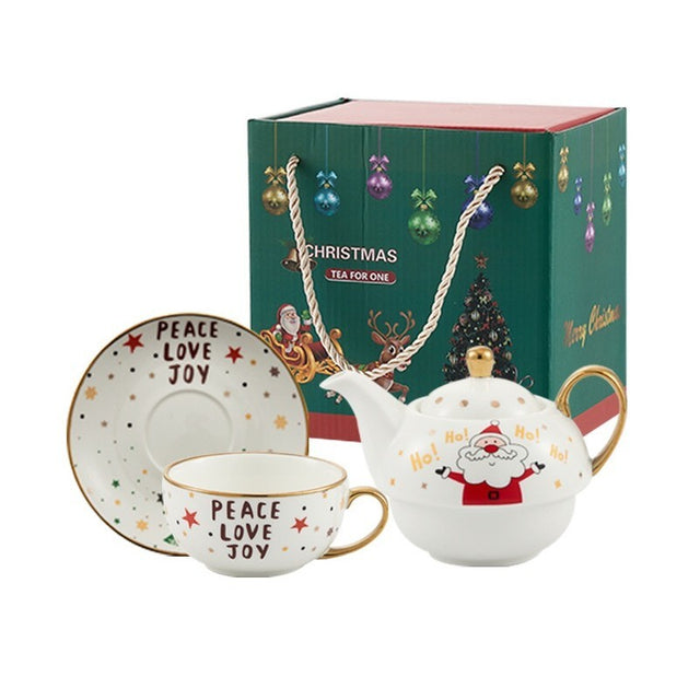 Set de Ceai, Flippy, Temă Crăciun, Ceainic 420 ml, Cană 310 ml, Farfurie, din Porțelan, Model Mos Craciun, Alb
